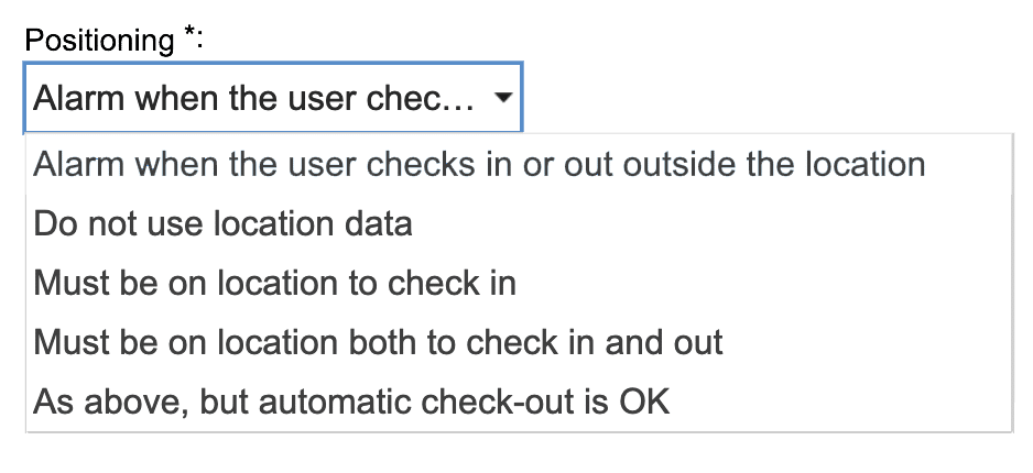 Must be on the location to check in and out. Check-in and check-out outside the approved area is not possible. Automatic check-out always happens when the user leaves the site and this setting cannot be combined with automatic check-out.